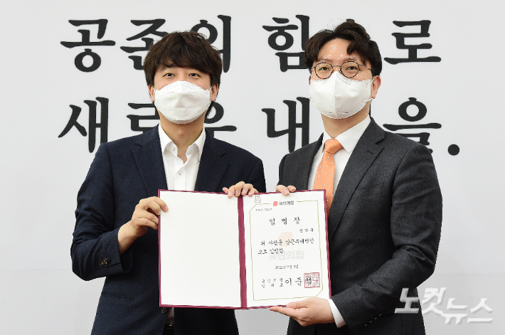 신인규 상근부대변인에게 임명장 수여하는 이준석 대표