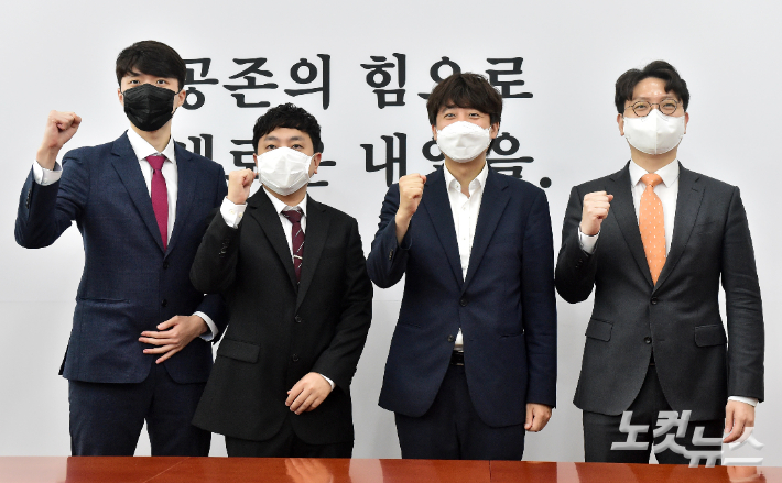 이준석 국민의힘 대표가 8일 국회에서 신임 대변인단 임명장 수여식을 마친 뒤 파이팅을 외치고 있다. 왼쪽부터 양준우, 임승호 대변인, 이 대표, 신인규 상근부대변인.