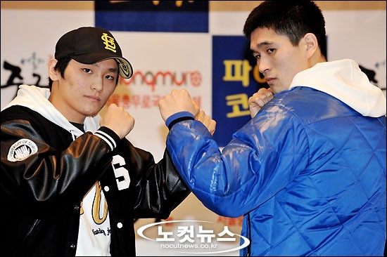 [BestNocut_R]3일 오전 서울 중구청에서 열린 제35회 프로복싱 전국 신인왕전 기자회견에서 웰터급 결승에서 맞붙을 김경진(왼쪽)-박재성 선수가 선전을 다짐하며 포즈를 취하고 있다.