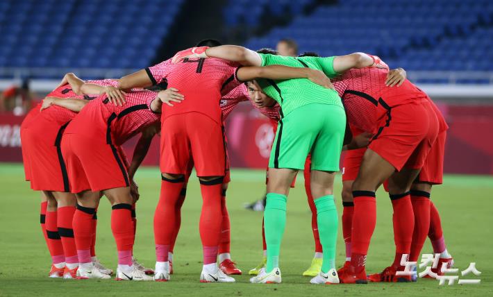2020 도쿄 올림픽 축구 8강전 대한민국 vs 멕시코의 경기가 열리고 있는 일본 요코하마시 요코하마 국제 종합 경기장에서 대한민국들이 경기 시작 전 파이팅을 외치고 있다.