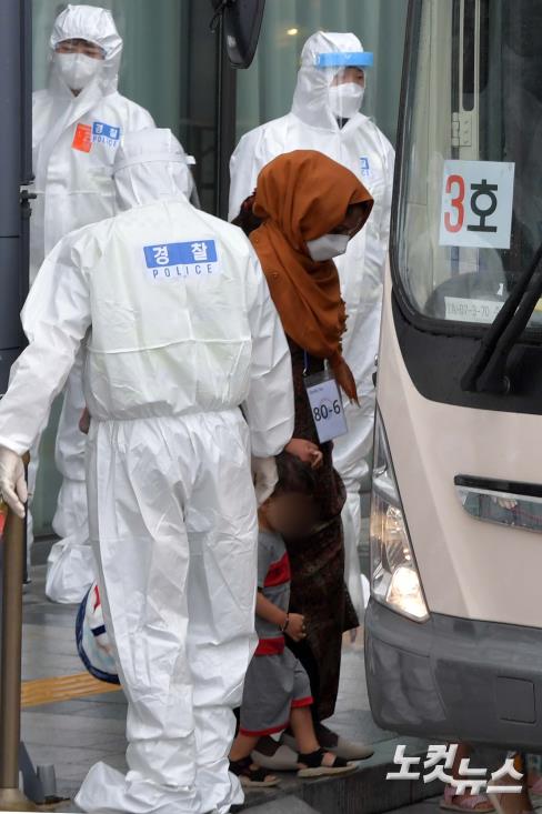 지난 26일 인천공항을 통해 '특별기여자' 신분으로 입국한 아프가니스탄(아프간)인들이 27일 김포 마리나베이호텔에서 임시 숙소인 충북 진천 국가공무원 인재개발원으로 이동하고 있다.