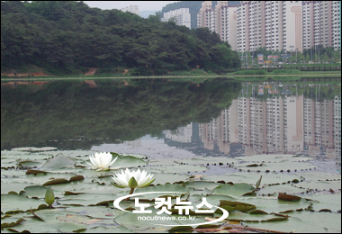 월드컵광주경기장 부근 풍암 저수지에 수련이 활짝 피었다. 지금 이 순간만큼은 물에 비친 아파트 단지보다 꽃 한송이가 귀해 보인다.(김영태기자/CBS광주)