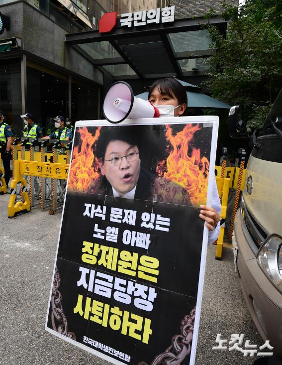 한국대학생진보연합 소속 학생이 27일 오후 서울 여의도 국민의힘 당사 앞에서 집행유예 기간 중 무면허 음주운전 및 경찰관 폭행 혐의를 받고 있는 래퍼 노엘(장용준)의 아버지 국민의힘 장제원 의원의 사퇴를 촉구하는 동시다발 1인시위를 하고 있다.
