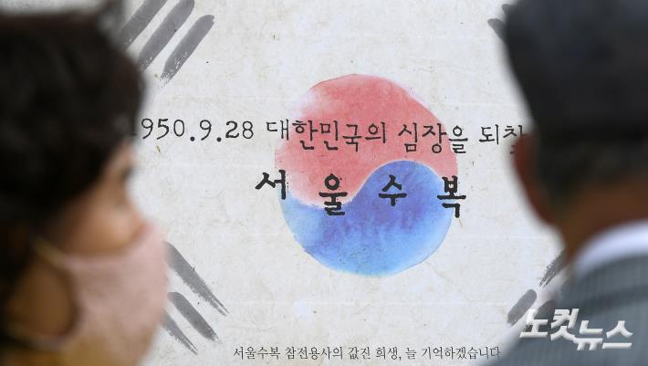 28일 서울 중구 서울도서관 꿈새김판에 '1950.9.28 대한민국의 심장을 되찾은 날'이란 문구가 적힌 대형 태극기가 걸려 있다. 서울수복은 1950년 6.25전쟁 발발 후 사흘 만에 서울이 점령당한 뒤 같은 해 9월 28일 서울을 다시 탈환한 일이다.