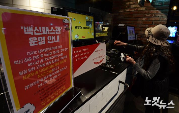 단계적 일상회복(위드 코로나) 첫 날인 1일 오후 서울 시내 한 영화관에 백신 2차 접종까지 모두 마치고 14일이 경과한 고객만 입장할 수 있는 상영관인 ‘백신패스관’ 안내문이 부착돼 있다.