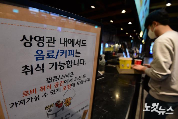단계적 일상회복(위드 코로나) 첫 날인 1일 오후 서울 시내 한 영화관에서 한 시민이 백신 2차 접종까지 모두 마치고 14일이 경과한 고객만 입장할 수 있는 상영관인 ‘백신패스관’ 용 팝콘을 구매하고 있다.