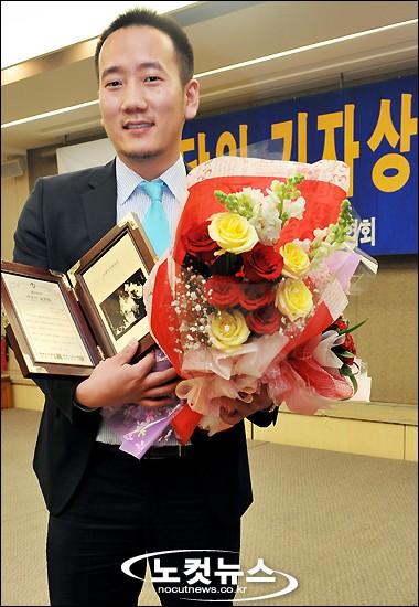[BestNocut_R]''''불길에 휩싸인 철거민'''' 사진 보도로 한국기자협회(회장 김경호)와 한국언론재단(이사장 고학용)이 주최하는 제221회 이달의 기자상 전문보도 부문 수상의 영광을 안은 CBS 노컷뉴스 한재호 기자가 19일 오전 서울 광화문 프레스센터 기자회견장에서 열린 시상식에서 상패와 꽃다발을 들고 감격하고 있다.