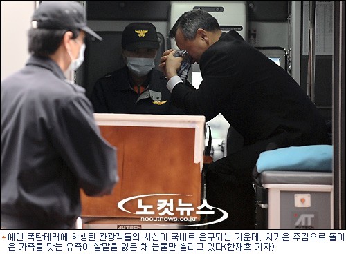 단지 여행이 좋아 낯선 땅을 찾았던 한국인 관광객들이 싸늘한 주검이 되어 돌아왔다. 이날 오후 3시 45분쯤 폭탄 테러로 숨진 희생자 4명의 시신은 푸른색 덮개로 씌워진 관 속에 담겨 비행기에서 내려졌다.