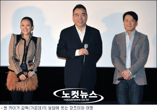 영화 ''매란방''의 언론시사회가 24일 오후 서울 왕십리 CGV에서 열린 가운데 연출을 맡은 첸 카이거 감독(가운데)의 무대 인사에 장쯔이와 여명이 해맑게 웃고 있다.