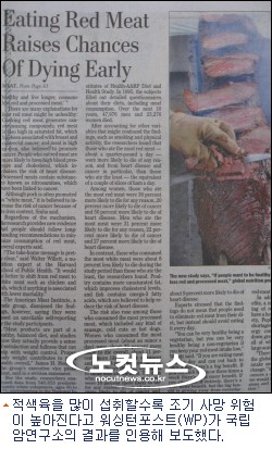 워싱턴포스트는 24일(현지시간) 국립암연구소가 50세 이상 백인남녀 50여만명을 대상으로 10년동안 추적조사를 실시한 결과 하루에 평균 4온스(작은 햄버거 크기)의 적색육을 섭취한 사람의 경우 심장질환이나 암(癌)으로 조기 사망할 확률이 30%이상 높은 것으로 나타났다고 보도했다.