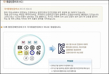 지식경제부 기술표준원은 26일 중복인증에 따른 기업의 경제적 부담을 줄여주고, 소비자들이 하나의 인증마크를 확인하여 좋은 제품을 고를 수 있는 기회를 주기위한 국가통합인증마크(KC마크)제도를 도입한다고 밝혔다.