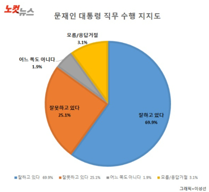 광주CBS가 무등일보와 전남일보, 뉴시스 광주전남본부와 공동으로 여론조사 전문기관인 한국갤럽에 의뢰해 지난 24일부터 이틀간 광주전남에 거주하는 만 18세 이상 남녀 1605명(광주 803명, 전남 802명)을 대상으로 실시한 유무선 전화 면접 조사를 진행한 뒤 통합해 재분석한 결과 '문재인 대통령이 직무를 잘 수행하고 있다고 보느냐?'는 질문에 응답자의 69.9%가 잘하고 있다고 응답했고 '잘못하고 있다'는 응답은 25.1%로 나타났다.