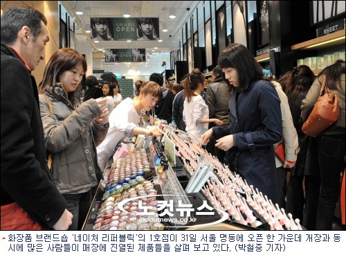 새로운 화장품 브랜드숍 ''네이처 리퍼블릭(대표 이규민)''이 31일 국내 최대 상권인 명동에 1호점을 오픈했다.
