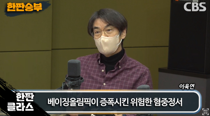 ◇ 박재홍> 한판승부가 자랑하는 금요일 2부 한판클라스 오늘 주제는 중국입니다. 베이징 동계올림픽 편파판정 논란 때문에 주목받고 있습니다만 요즘 몇 년 사이 '반중 정서'가 굉장히 눈에 띄게 늘었죠. 예전 세대에선 중국이 삼국지, 홍콩 영화. 무협지로 상징이 되면 요새는 사드, 미세먼지, 동북공정, 홍콩 시위 이런 게 중국 관련 검색어가 되고 있는데요. 2022년 지금의 중국, 현대 중국 얘기를 해 보겠습니다. 오늘 모신 분 서강대학교 중국문화학과의 이욱연 교수입니다. 교수님, 어서 오십시오.