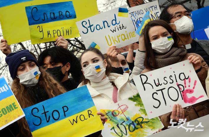 28일 오전 서울 중구 주한 러시아 대사관 앞에서 열린 ‘러시아의 우크라이나 침공 중단·평화적 해결 촉구 시민사회 공동 기자회견’에 참석한 재한 우크라이나인들이 손피켓을 들어보이고 있다.