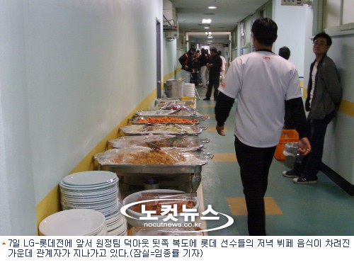 프로야구 LG-롯데전이 열린 지난 7일 잠실구장. 3루 측 덕아웃 뒷쪽 복도에는 분주하게 오가는 선수들과 관계자들 사이로 푸짐한 진수성찬이 차려졌다. 원정팀 롯데 선수들을 위한 뷔페 저녁 식사였다.