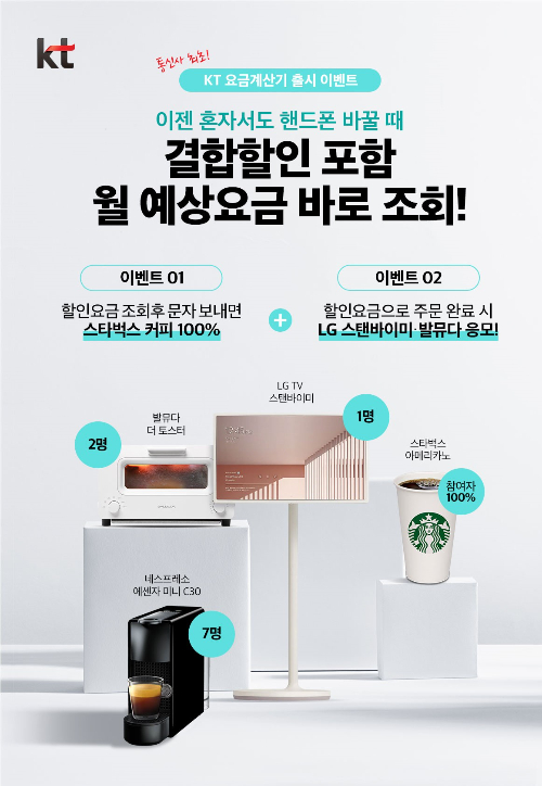 KT는 요금계산기 서비스 출시와 함께 이달 1일부터 15일까지 요금계산기를 통해 온라인 단말 주문을 완료한 고객을 대상으로 LG 스탠바이미, 발뮤다 등 인기 가전을 추첨해 제공하는 이벤트를 진행한다.