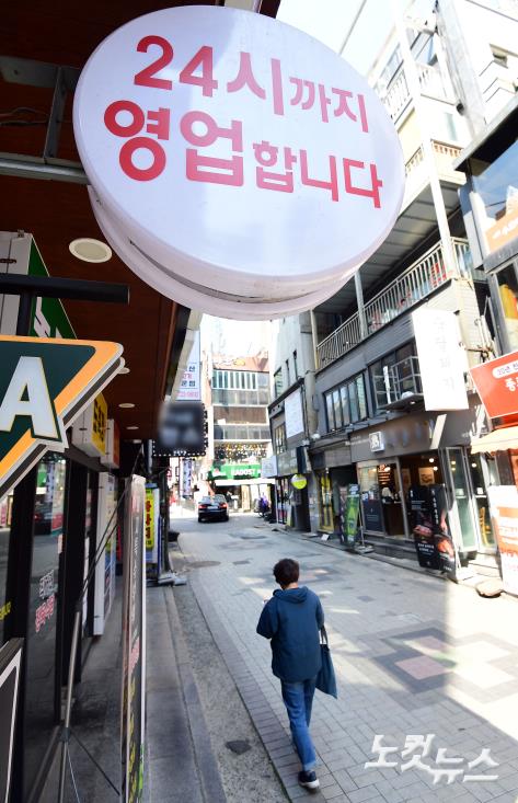 오는 17일까지 2주간 사적모임은 최대10명, 다중이용시설의 영업시간은 밤12시까지 확대하는 새 '사회적 거리두기' 조정안이 시행된 4일 서울 한 음식점에 24시까지 영업을 알리는 간판이 설치돼 있다.