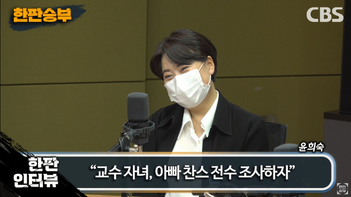 ◆ 윤희숙> 이게 이런 식으로 가다가는 전 나라가 한 걸음도 앞으로 나갈 수 없다고 생각해요. 조국 전 장관 때 사회가 그렇게 분노를 했으면 그러면 사회지도층 입장에서는 그것보다는 좀 더 나은 잣대를 적용해야 되는 거죠.