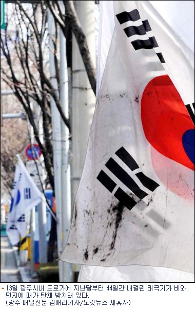 지난달 부터 44일동안 3·1절과 임시정부 수립일을 기념하기 위해 태극기가 장기 게양됐지만 관리 소홀과 시민들의 무관심 탓에 의미가 퇴색되면서 ''빛이 바랬다''는 지적이 크다.