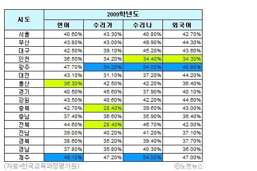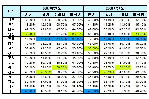 한국교육과정평가원은 15일 2005학년도와 2009학년도간 수능 성적향상도를 분석한 결과 서울과 충남, 전남, 제주 지역은 상위 40%인 1~4등급 비율이 증가한 것으로 나타났다고 밝혔다.