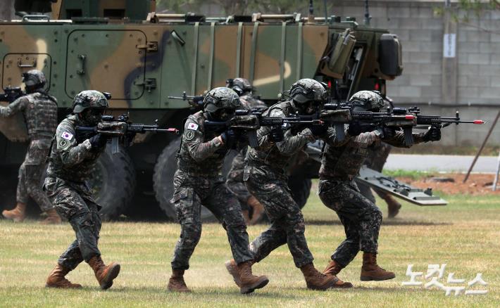 10일 경기 양주시 25사단 사령부 일대에서 열린 아미 타이거 시범여단전투단 선포식에서 장병들이 유·무인 전투체계 전투수행 시연을 하고 있다.