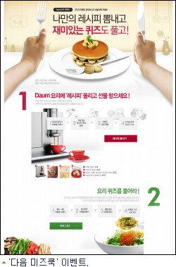 다음커뮤니케이션(www.daum.net)은 요리전문 서비스 ''다음 미즈쿡''(cook.miznet.daum.net)이 지난 2월 말 오픈한 후 사용자들의 호응을 얻으며 트래픽이 지속적으로 상승하고 있어, 이에 보답하고자 이번 달 말까지 ''나만의 레시피를 뽐내고 재미있는 퀴즈도 풀고!'' 이벤트를 진행, 커피 머신 등 푸짐한 경품을 증정한다고 밝혔다.
