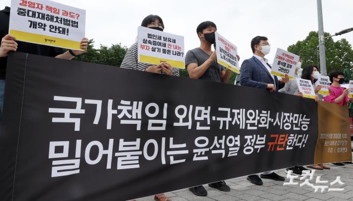 참여연대 관계자들이 20일 오전 서울 용산구 대통령 집무실 앞에서 국가책임 외면·규제완화·시장만능 밀어붙이는 윤석열 정부 규탄 기자회견을 열고 '새정부 경제정책방향' 전면 수정 등을 촉구하고 있다.