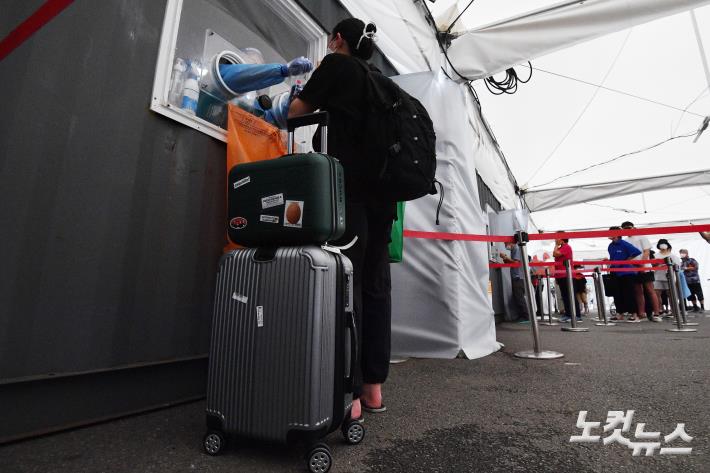 광복절 연휴 영향으로 코로나19 검사량이 감소하면서 신규 확진자 수가 8만명대에 그친 16일 오후 서울역 임시선별진료소에서 시민들이 검사를 받고 있다. 정부가 이달 말 20만 명 이내 수준에서 유행 정점 구간에 들어설 것으로 예측한 가운데 광복절 연휴와 개학이 변수가 될 전망이다.