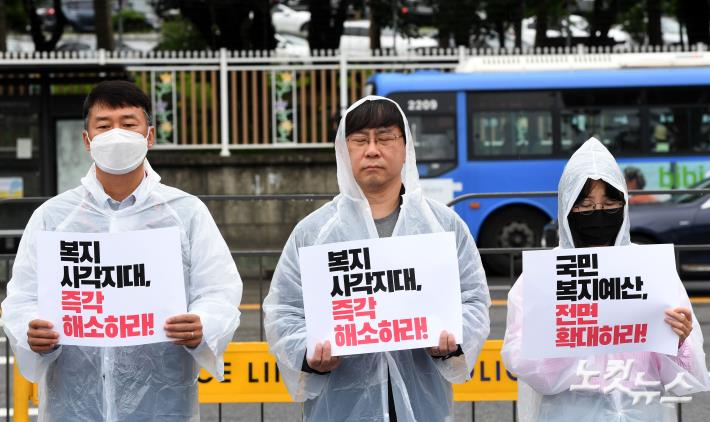 29일 오전 서울 용산구 전쟁기념관 앞에서 열린 ‘취약계층 생존보장! 복지 사각지대 해소, 복지예산 및 복지인력 확대 촉구’ 기자회견 참석자들이 손피켓을 들고 있다.
