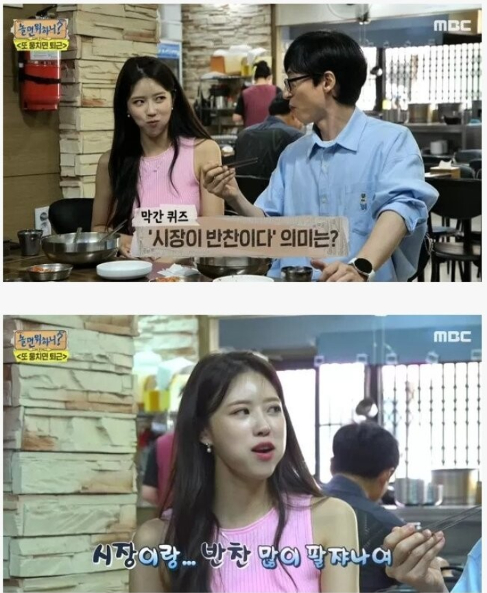 '시장이 반찬이다'라는 의미를 모르는 연예인. 놀면뭐하니 캡처◇ 유상원> 연예인들이 이렇게 실수하는 모습이 부쩍 자주 보이는 것 같긴 합니다.◆ 박소영> 네, 맞습니다. 방금도 언급했듯이 티비 프로그램에서, 특히 예능에서 백치미 캐릭터를 흔히 볼 수 있습니다. 하지만 이러한 모습이 너무 자주 노출되는 나머지 가끔은 '정도가 지나치다'는 생각이 들기도 합니다. 방송에 보여지는 연예인들은 특히 어린 아이들에게 상당한 영향을 끼치는데, 연예인들의 이러한 모습들이 아이들에게 지속적으로 보여지는 것에 대해 조금 신중한 입장을 취해야 할 것이라는 생각이 듭니다.