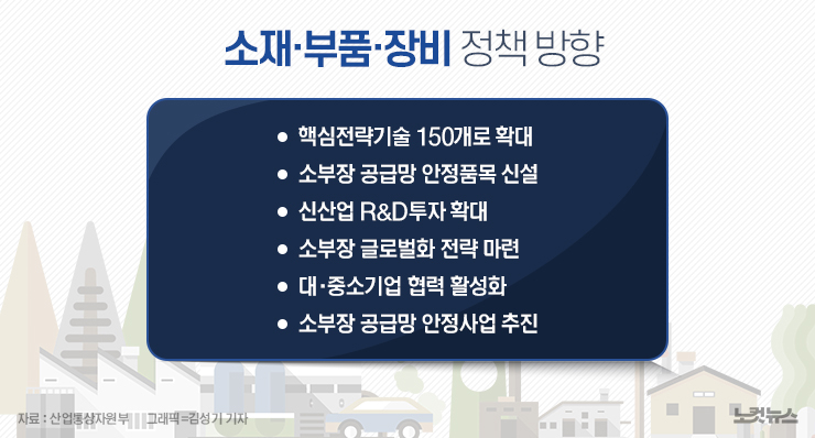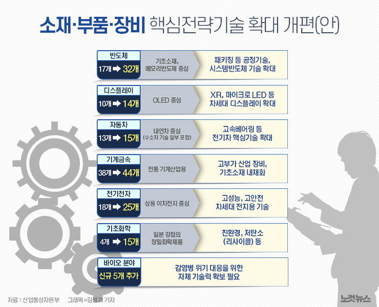 정부는 소부장 핵심전략기술을 기존 100개에서 150개로 확대 개편하기로 했다. 핵심전략기술 7대 분야는 '반도체·디스플레이·자동차·기계금속·전기전자·기초화학·바이오'로 구성돼 있다. 특히 반도체 분야 핵심 기술은 반도체 공정에 필요한 불화수소·포토레지스트 등 소재 중심에서 패키징 후공정 등 공정기술까지 확대하고, 메모리 반도체 기술뿐 아니라 시스템 반도체 기술까지 포함하기로 했다.