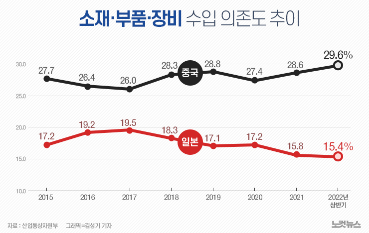 정부가 2019년 일본의 수출규제에 맞서 소부장 핵심 전략기술을 선정해 지원한 결과 올해 상반기 소부장 제품의 일본 수입 비중은 역대 최저인 15.4%까지 낮아졌다. 하지만 대중 의존도는 2012년 24.9%에서 올해 상반기 29.6%로 확대되는 부작용이 나타났다. 정부는 "지난해 요소수 사태에 대응하지 못한 한계점이 있었다"면서 "소부장 산업의 글로벌화를 지원해 대중 의존도를 줄이겠다"고 말했다.
