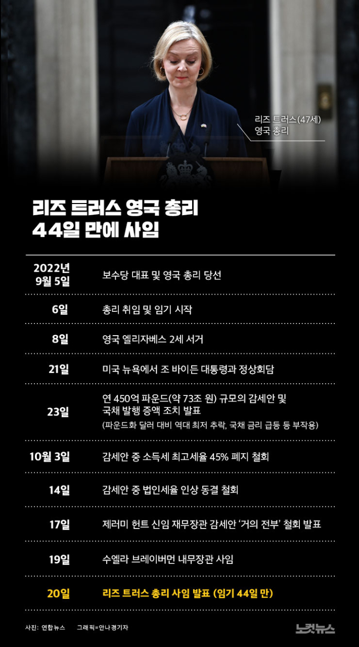 이날 사임을 전격 발표한 트러스 총리의 하야 소식에 대한 영국 언론의 풍자를 소개한 기사다.
