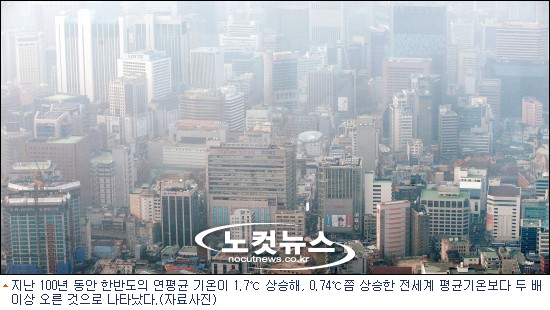 기상청이 국립기상연구소의 연구결과를 바탕으로 발간한 ''한반도 기후변화''에 따르면, 지난 100년 동안 한반도의 연평균 기온이 1.7℃ 상승해, 0.74℃쯤 상승한 전세계 평균기온보다 두배 이상 오른 것으로 나타났다.
