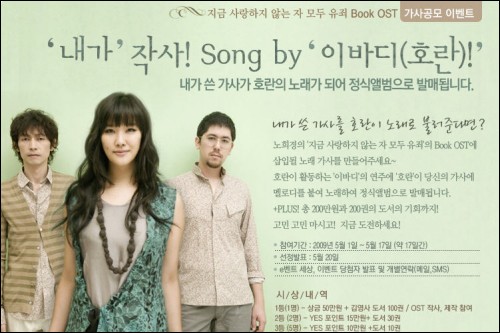 대한민국 1위 인터넷서점 예스24(www.yes24.com)는 17일까지 노희경 작가의 에세이집 ''지금 사랑하지 않는 자 모두 유죄'' 북OST 제작에 독자들의 가사 공모를 받는다.