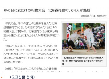 어머니의 날(10일)을 맞아 홋카이도에서 여성 64명이 참가한 가운데 여자 스모대회가 열렸다고 도쿄신문이 보도했다.(사진)