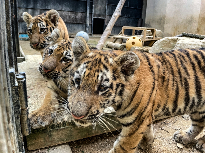 시베리아 호랑이 어미 펜자와 아기호랑이 해랑·파랑·사랑. 서울대공원 제공서울대공원(원장 김재용)은 10일 호랑이해인 올해 4월 23일 태어난 아기호랑이 해랑·파랑·사랑 3마리를 11일부터 일반에 공개한다고 밝혔다.
