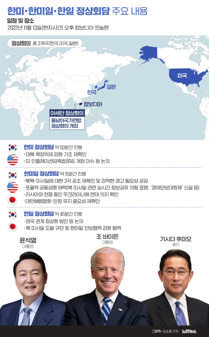 윤석열 대통령과 조 바이든 미국 대통령, 기시다 후미오 일본 총리가 캄보디아에서 연쇄회담을 열고 한 자리에 모였다.