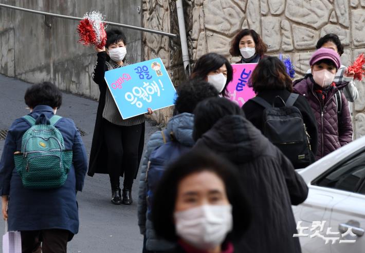 2023학년도 대학수학능력시험을 이틀 앞둔 15일 오후 서울 마포구 일성여자중고등학교에서 수능 격려 떡을 전달 받은 수험생들이 재학생들의 응원을 받으며 학교를 나서고 있다.