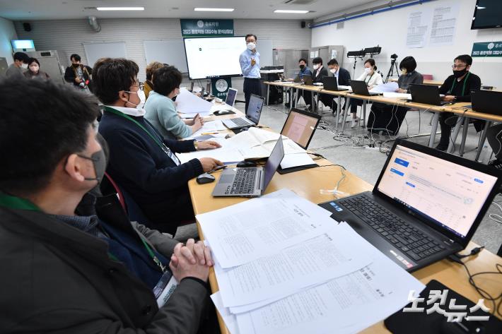 2023학년도 대학수학능력시험일인 17일 오전 서울 마포구 강북종로학원에 설치된 수능 문제분석 상황실에서 국어과 강사들이 수능 문제를 분석하고 있다.