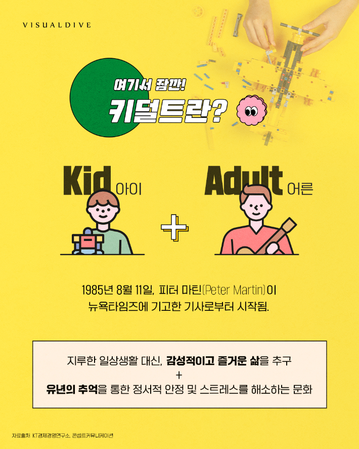 Kid와 Adult의 합성어 '키덜트'. 비주얼다이브 캡처 ◇ 유상원> 키덜트 문화는 예전에도 있었던 것으로 기억하는데요. 특별히 오늘 주제를 키덜트로 정한 이유가 있을까요?◆ 허윤> 말씀해주신 것처럼 키덜트 문화는 20여 년 전에도 있었습니다. 하지만 그 당시에는 키덜트가 비주류로 여겨졌습니다. 지금은 어느덧 키덜트 문화가 주류로 자리잡았고, 특히 MZ세대 사이에서 주목받고 있는데요. 그래서 오늘 청정수의 주제로 키덜트를 정했습니다.