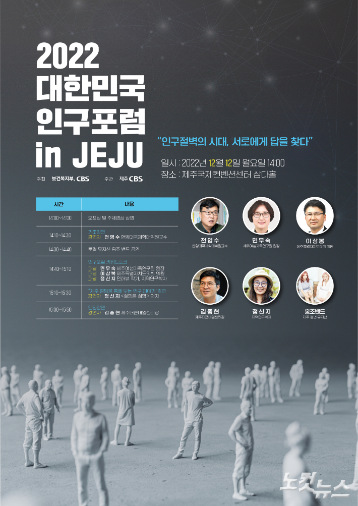 제주CBS와 보건복지부가 오는 12일 오후 2시 제주국제컨벤션센터 삼다홀에서 '2022 대한민국 인구포럼 in JEJU'를 개최한다.