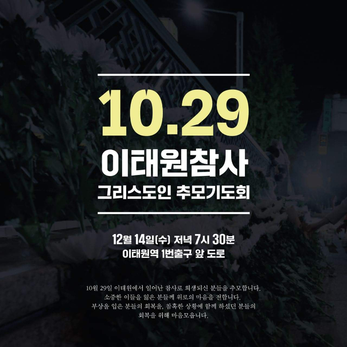 10.29 이태원 참사 유가족들과 함께하는 그리스도인 추모기도회가 14일 저녁 7시30분 서울 이태원역 1번 출구 앞 도로에서 열린다.