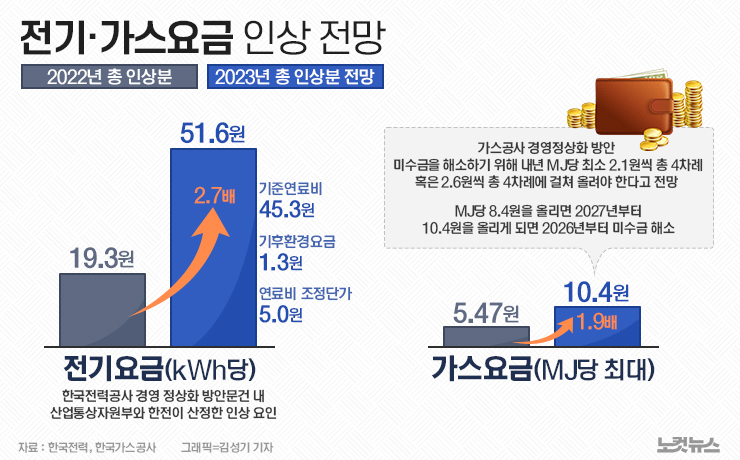 내년 전기요금 51.6원·가스는 최대 10.4원으로 인상 전망[그래픽뉴스]
