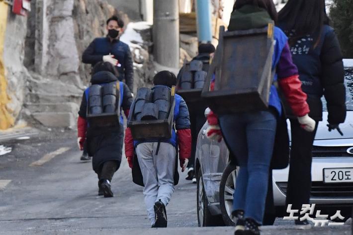28일 오후 서울 홍제동 개미마을에서 행복공감봉사단이 연탄 나눔 봉사활동을 하고 있다.
