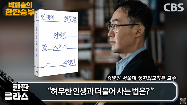 ◇ 박재홍> 오늘 한판클라스 인생의 허무를 어떻게 할 것인가의 저자인 서울대학교 김영민 교수님과 만나서 인생과 삶에 대한 얘기를 했는데요. 마지막에 산책과 같은 삶에 대한 선물을 받은 것 같습니다. 교수님, 인생의 허무를 보다도 잘 찾아서 읽도록 하겠습니다. 오늘 귀한 말씀 고맙습니다. 감사합니다.