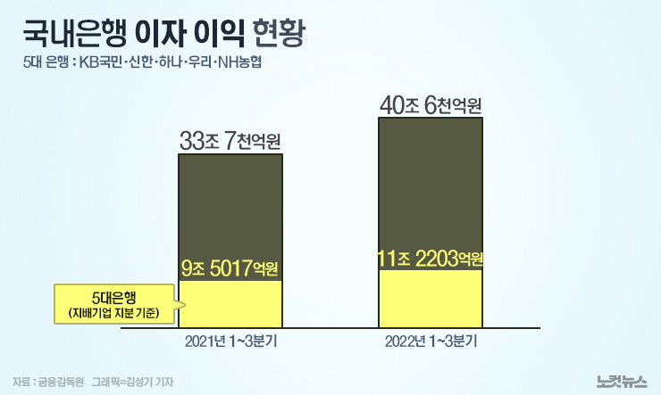 금융감독원에 따르면 국내은행의 지난해 1~3분기 이자 이익은 전년 동기 대비 6조 9천억원 증가한 40조 6천억원으로 사상 최대 규모를 기록했다. 5대 은행(KB국민·신한·하나·우리·NH농협)의 누적 순이익(지배기업 지분 기준)은 11조 2203억원으로 전년 같은 기간보다 약 18% 증가했다.