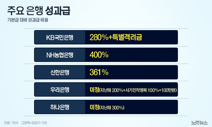 주요 은행들이 지난해 역대급 실적을 바탕으로 직원들에게 기본급 300~400%에 달하는 성과급을 지급할 전망이다. 벌어들인 수익을 직원들과 나누는 것은 당연한 일이지만, 금리 상승기 일반 국민의 빚 부담이 늘어나는 가운데 은행들만 이자 장사로 배를 불린다는 지적이 나온다.