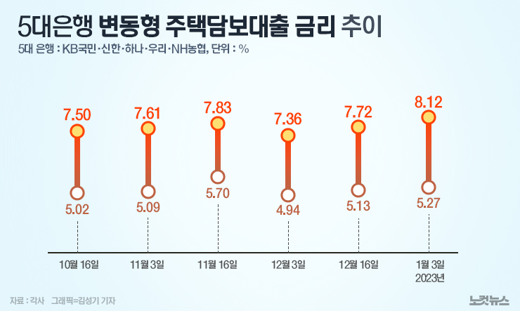 금융권에 따르면 KB국민, 신한, 하나, 우리 등 4대 은행의 주택담보대출 변동금리는 연 5.27~8.25%로 집계됐다. 당장 8%대 최고 금리를 적용받는 대출자는 많지 않겠지만 은행에서 실제 취급되는 대출 금리도 계속 오르고 있다는 점이 문제다.